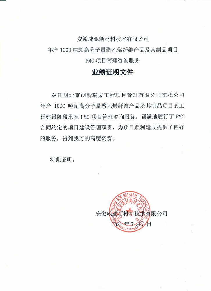 安徽威亞新材料技術(shù)有限公司年產(chǎn)1000噸超高分子量聚乙烯纖維產(chǎn)品及其制品項(xiàng)目業(yè)績(jī)證明(2021)