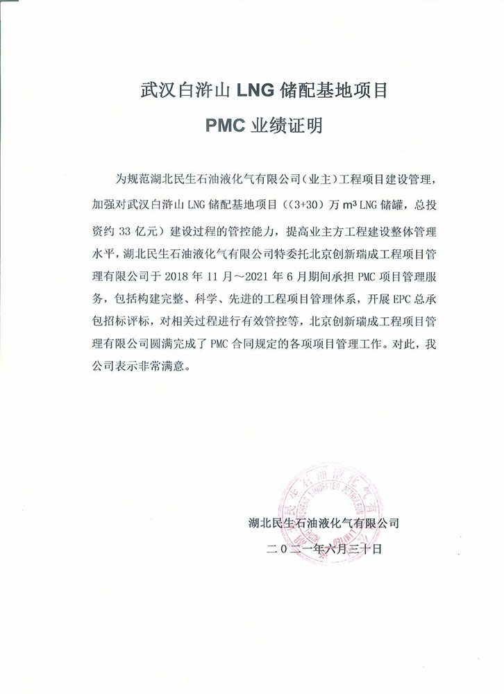武漢白滸山LNG儲(chǔ)配基地項(xiàng)目PMC業(yè)績(jī)證明(2021)