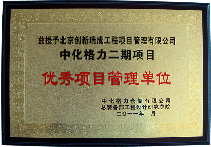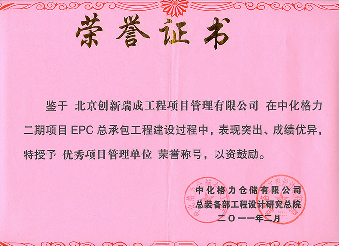 中化格力二期項(xiàng)目EPC總承包優(yōu)秀項(xiàng)目管理單位證書(shū)(2011)