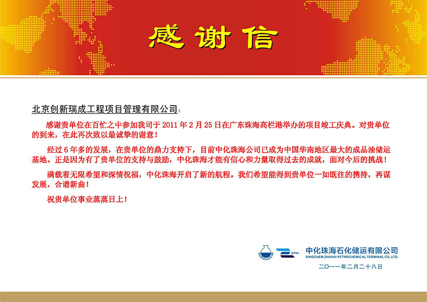中化珠海石化儲(chǔ)運(yùn)有限公司感謝信(2011)