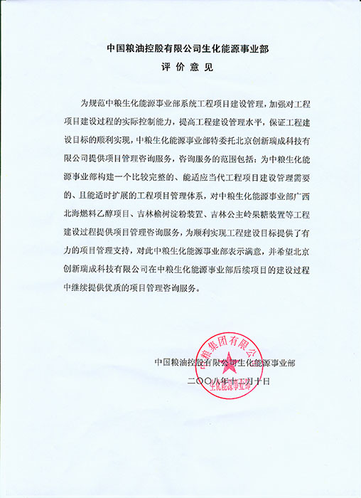 咨詢(xún)工作獲中糧生化能源事業(yè)部表?yè)P(yáng)信(2008)