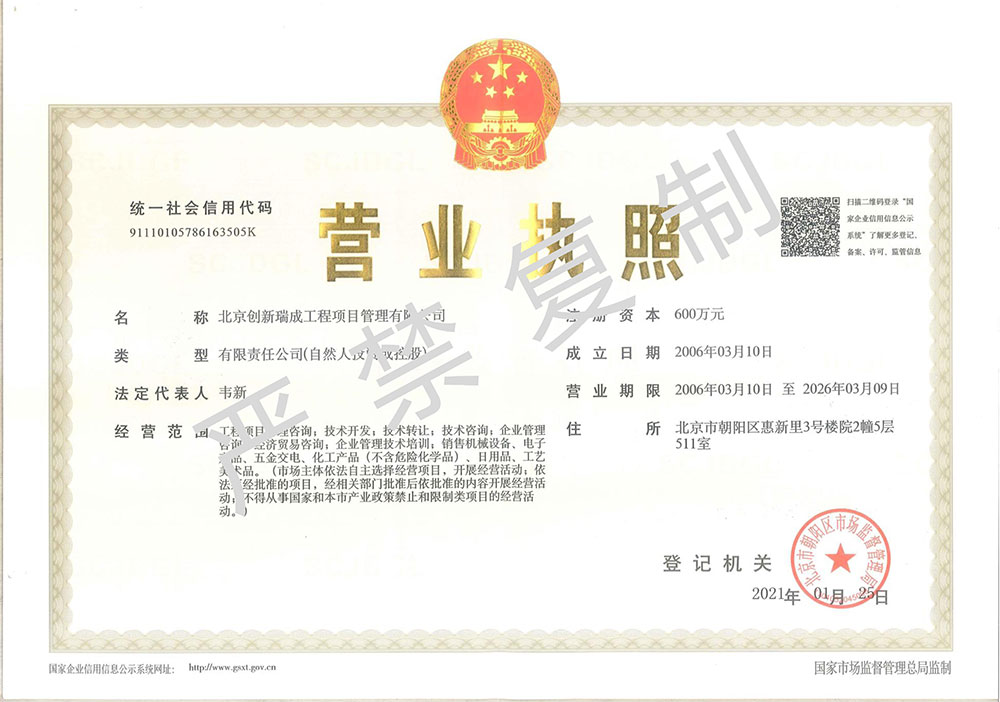 北京創(chuàng)新瑞成工程項(xiàng)目管理有限公司營(yíng)業(yè)執(zhí)照