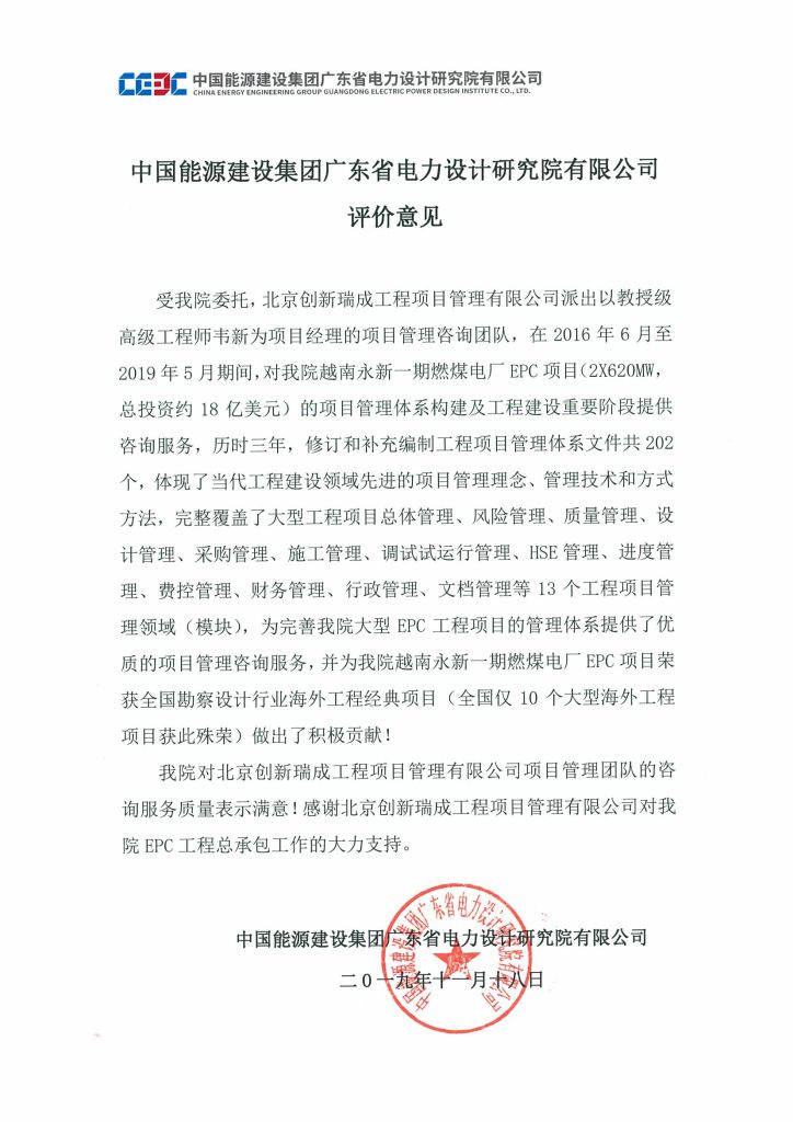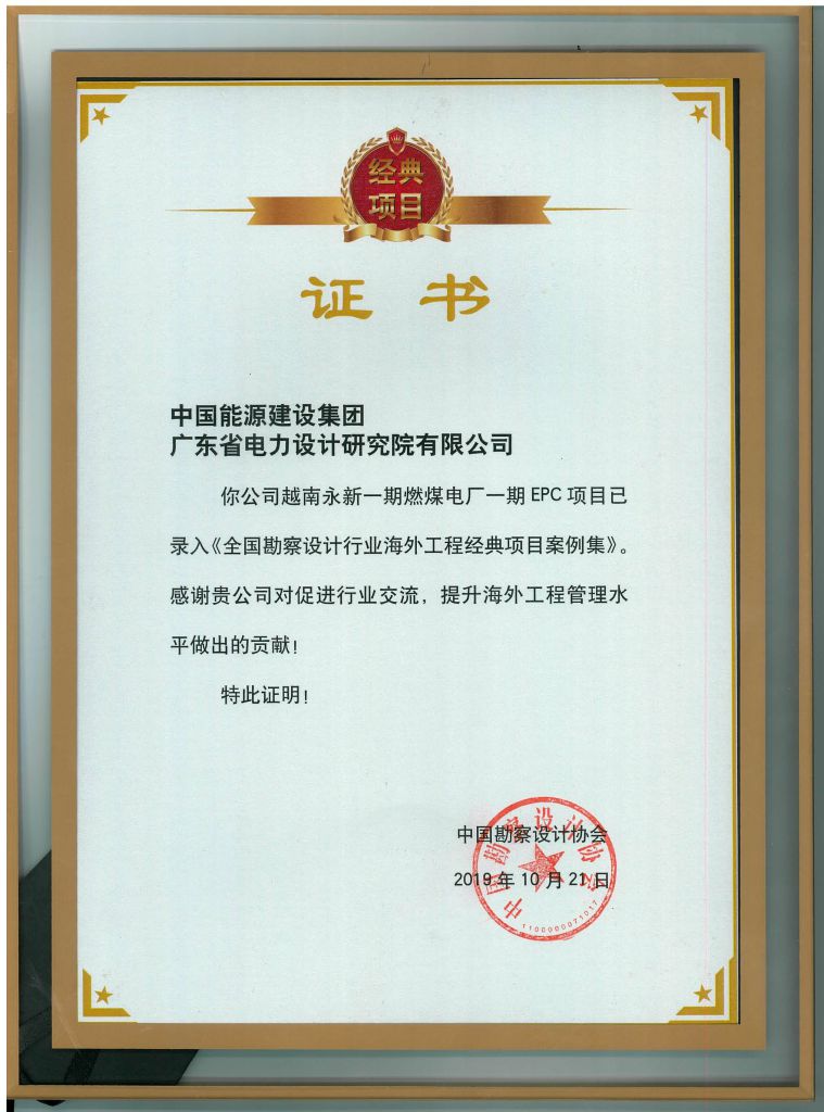 本項目在2019年10月榮獲全國勘察設計行業海外工程經典項目(全國僅10個大型海外工程項目獲此殊榮),廣東院于2019年11月18日向我公司出具項目管理咨詢服務《評價意見》,對我公司的項目管理咨詢服務工作給予高度評價。
